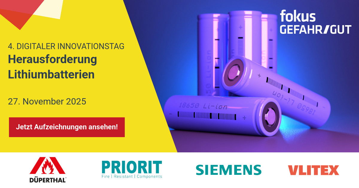 Lithiumbatterien verzeichnen Jahr für Jahr sehr hohe Wachstums - und Entwicklungsraten. Dabei ist Produktion, Logistik und Entsorgung von Lithiumbatterien weiterhin mit Risiken verbunden. Am 27. November 2025 haben Anbieter in kurzen Online-Slots ihre innovativen Ideen, Tools, marktfähigen Produkte und Dienstleistungen vorgestellt, die das Risiko im Verlauf eines Akkulebens deutlich eingrenzen.