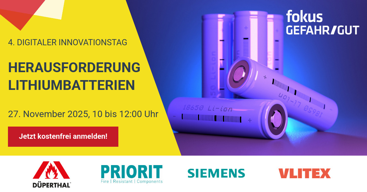Lithiumbatterien verzeichnen Jahr für Jahr sehr hohe Wachstums - und Entwicklungsraten. Dabei ist Produktion, Logistik und Entsorgung von Lithiumbatterien weiterhin mit Risiken verbunden. Am 27. November 2025 stellen Anbieter in kurzen Online-Slots ihre innovativen Ideen, Tools, marktfähigen Produkte und Dienstleistungen vor, die das Risiko im Verlauf eines Akkulebens deutlich eingrenzen.