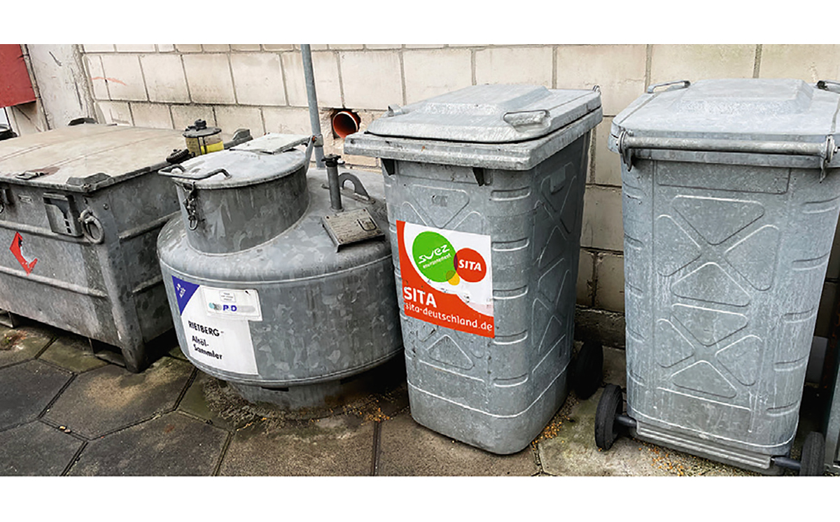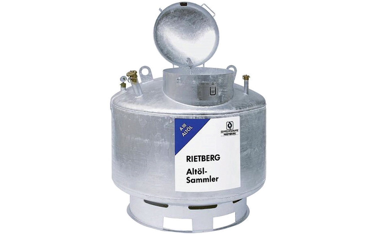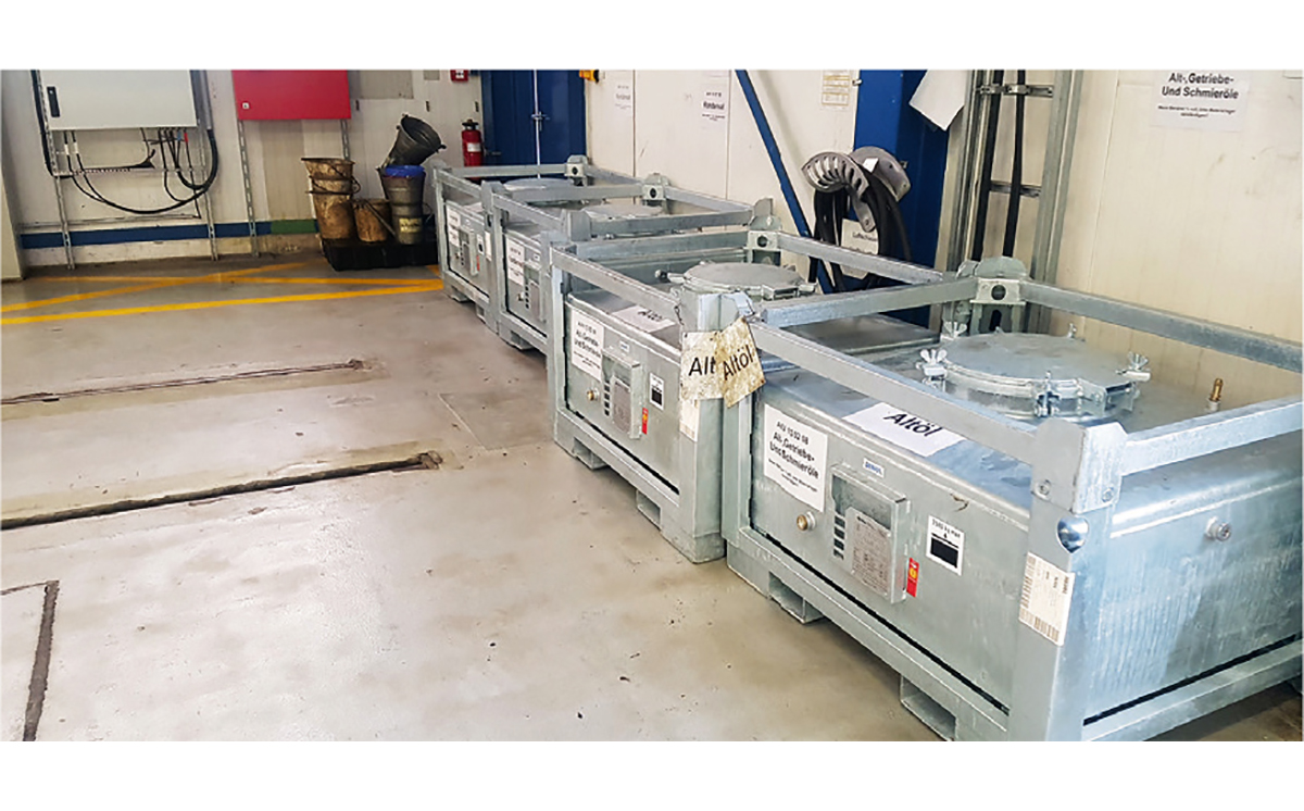 Rechts neben dem Altölsammelbehälter stehen zwei Behälter zur Sammlung und Lagerung von „ölverschmutzten Betriebsmitteln“.