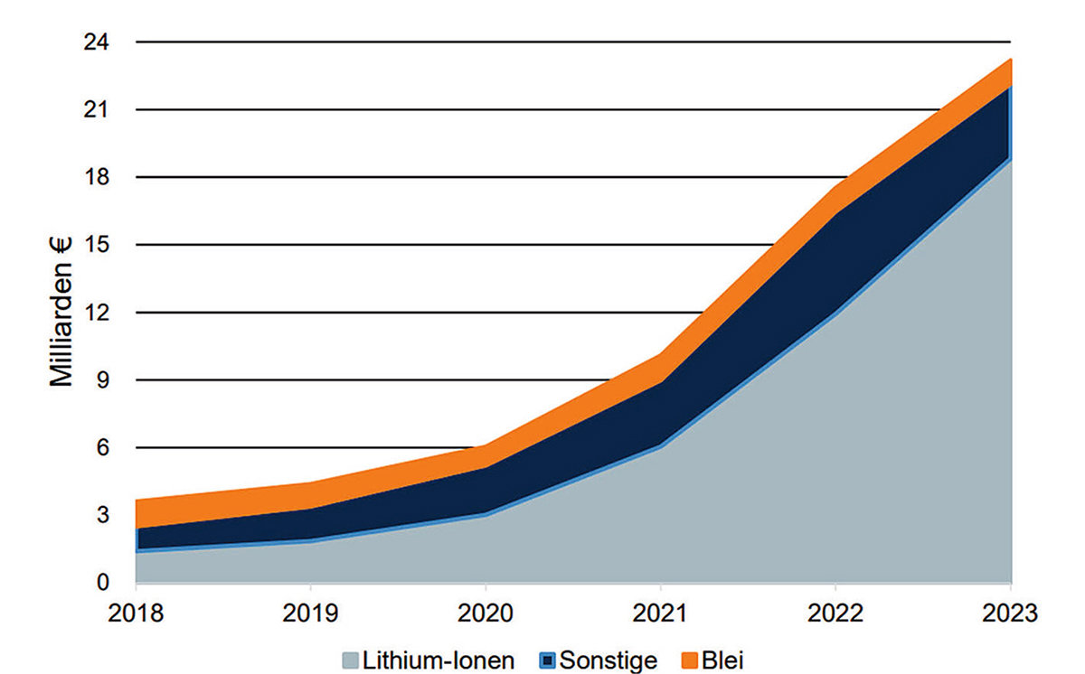 Betrachtet man hierzulande den Zeitraum zwischen 2019 und 2023, so wuchs der Batteriemarkt um 429 Prozent. Das Marktvolumen bei Lithium-Ionen-Batterien hat sich im Vergleich zu 2019 mehr als verneunfacht – was in erster Linie auf den hohen Anstieg der Importe nach Deutschland zurückzuführen ist.